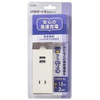 USBポート付電源タップ 雷ガード 2個口/2USB 1.5m 白|HS-TU215M-W 00-4396