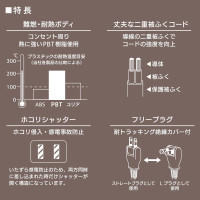 ● コンセント周りに熱に強いPBT樹脂使用、難燃・耐熱ボディ