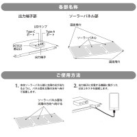 ■ 定格出力:Type-A/Type-C…5V/3A、9V/2A、12V/1.5A(最大)、DC5521…12V1.5A(最大) ※太陽光の強さ、気温によって、充電効率が大きく変化します。設置方法や天候などの充電環境によって、必要な出力が得られない場合があります。