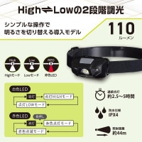 ■ 光束:HIGHモード…約110 lm (ルーメン)、LOWモード…約50 lm (ルーメン)