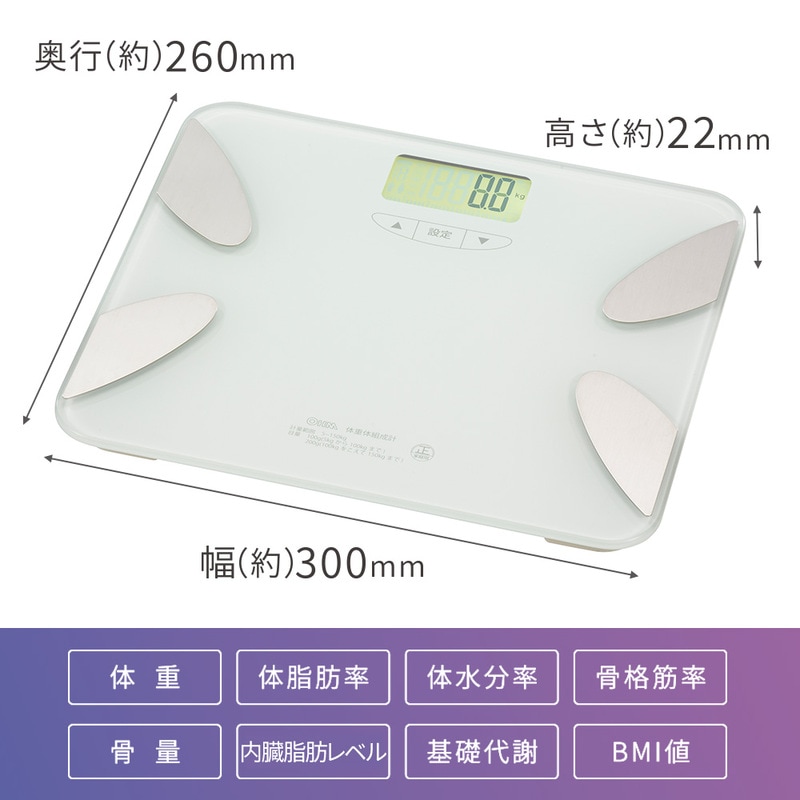 ● 体重、体脂肪率、体水分率、骨格筋率、骨量、内臓脂肪レベル、基礎代謝、BMI値が測れる