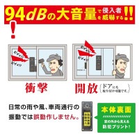 ● 取り付けた窓ガラスへの衝撃やガラスの破損・ドアの開放を検知すると、大音量のアラーム(約94dB)が鳴り続けます。 (注意:侵入者を威嚇するため、防犯アラームは解除するまで鳴り続けます。)